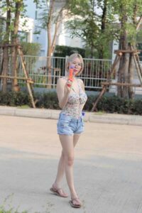 เราขอรีวิว เจ๊มิลค์ คนนี้กันหน่อย ความสวยเซ็กซี่จัดว่าเด็ดจริง เราชอบผมสั้นสีทองที่ทำให้เจ๊ดูสวย หน้าสว่าง และดูเป็นสาวฝรั่งที่มั่นใจในตัวเองสูงมาก โครงหน้าดีเป็นแบบรูปไข่ได้สัดส่วนพอดี คางแหลมไม่มากนัก หน้าผากก็เนียนกริบกำลังดี คิ้วเข้มเหินขึ้นเล็กน้อย
